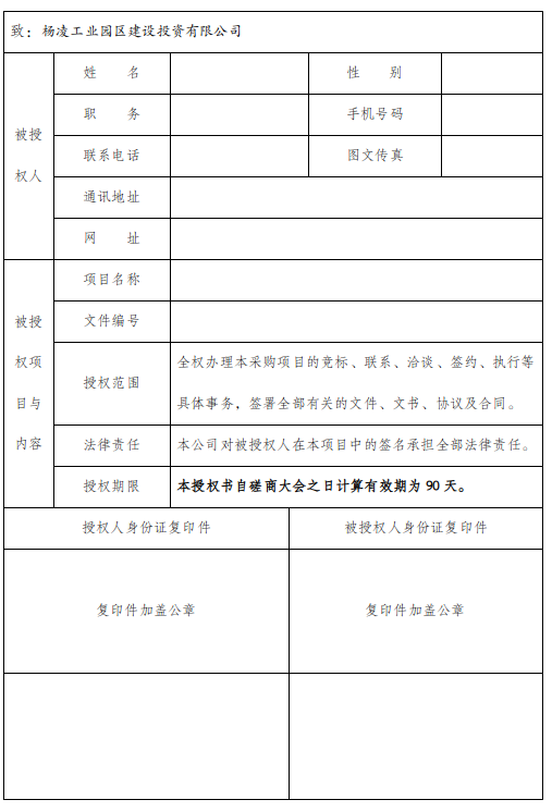 2、法人授权委托书。法定代表人亲自参加投标时,须提供本人身份证复印件;法定代表人授权他人参加投标时,须提供法定代表人委托授权书并出示被授权代表的身份证复印件,非法人单位参照执行;